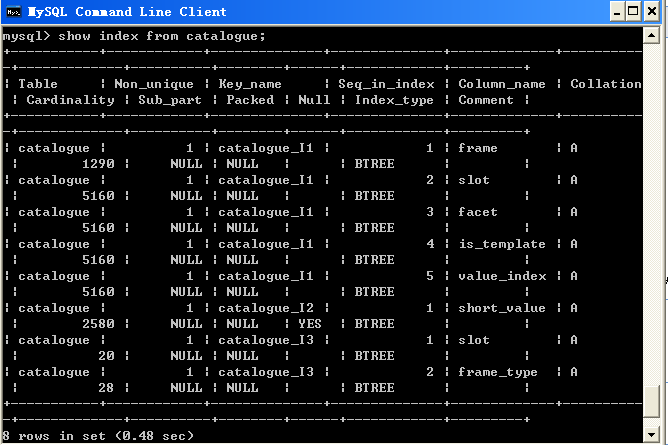 大侠,我的table名叫catalogue,我输入"show index from catalogue;"命令,是否显示了行和列?