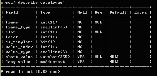 我在mysql的命令行中,输入"describe catalogue",显示如下图,请高手们帮帮看看,小妹基础太差了。